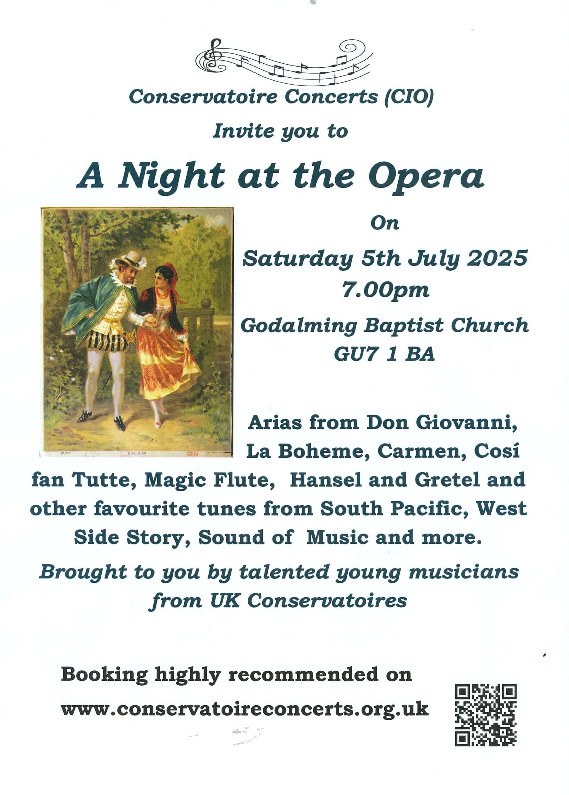 Conservatoire Concerts presents A Night at the Opera on Saturday, 5 July 2025, at 7.00pm at the Godalming Baptist Church, Queen Street, Godalming GU7 1BA.