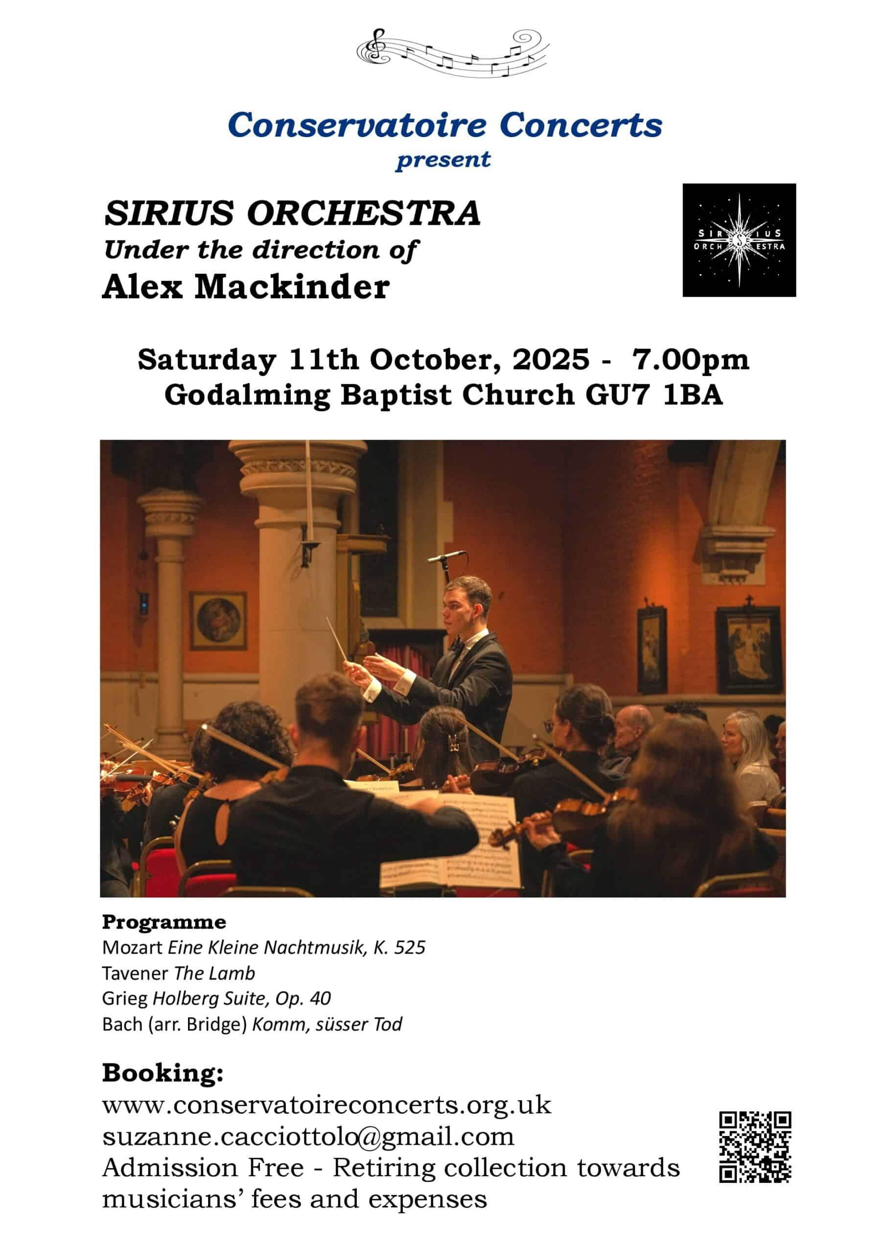 Conservatoire Concerts presents the Sirius Orchestra, under the director of Alex Mackinder, on Saturday, 11 October 2025, at 7.00pm at the Godalming Baptist Church, Queen Street, Godalming GU7 1BA.
